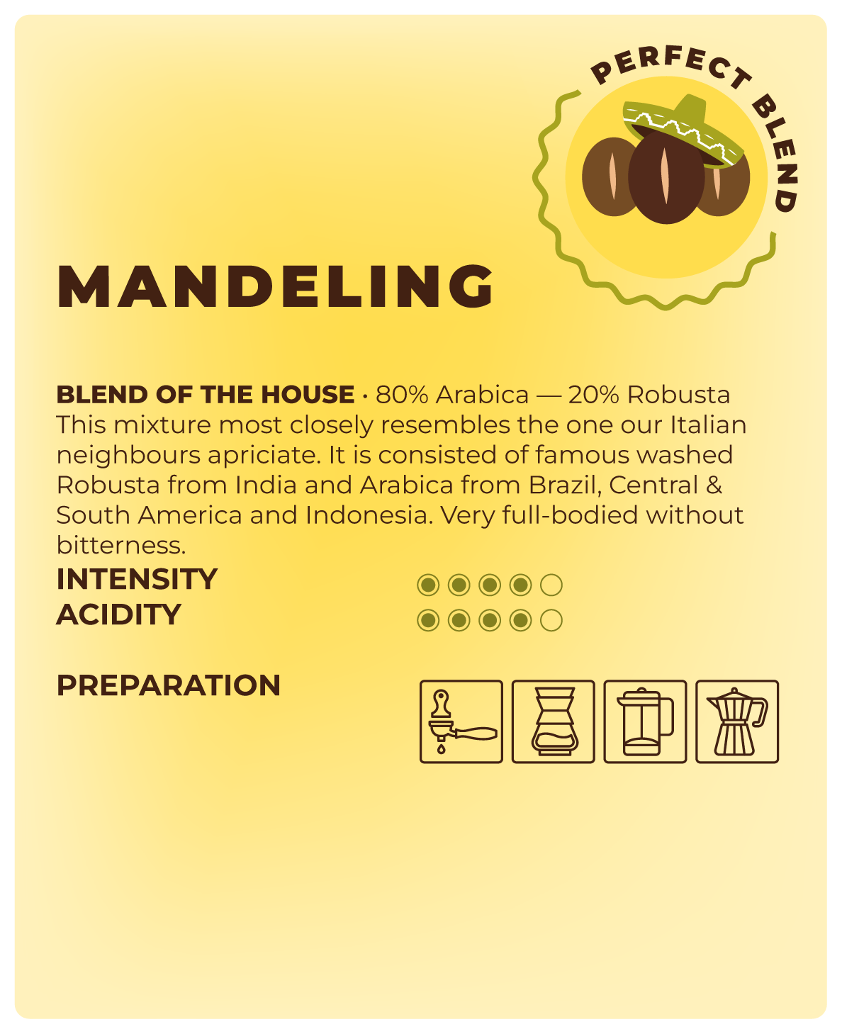 Découvrez le Mandeling, notre mélange le plus proche de l’authentique espresso italien. Composé d’Arabicas du Brésil, d’Haïti, d’Amérique Centrale et du fameux Robusta lavé du Rwanda, il offre une intensité corsée sans amertume. Parfait pour un espresso riche en arômes et en caractère.